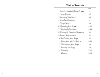 This document provides an instruction manual for Sightron riflescopes. It covers scope features, focusing the scope, parallax adjustment, mounting the scope, sighting in the gun, windage and elevation adjustments, battery replacement, re-zeroing, and using the mil-dot reticle. The manual describes the different types of scopes, how to focus and adjust them, and provides guidance on properly mounting, sighting in, and maintaining the scope to ensure optimal performance.