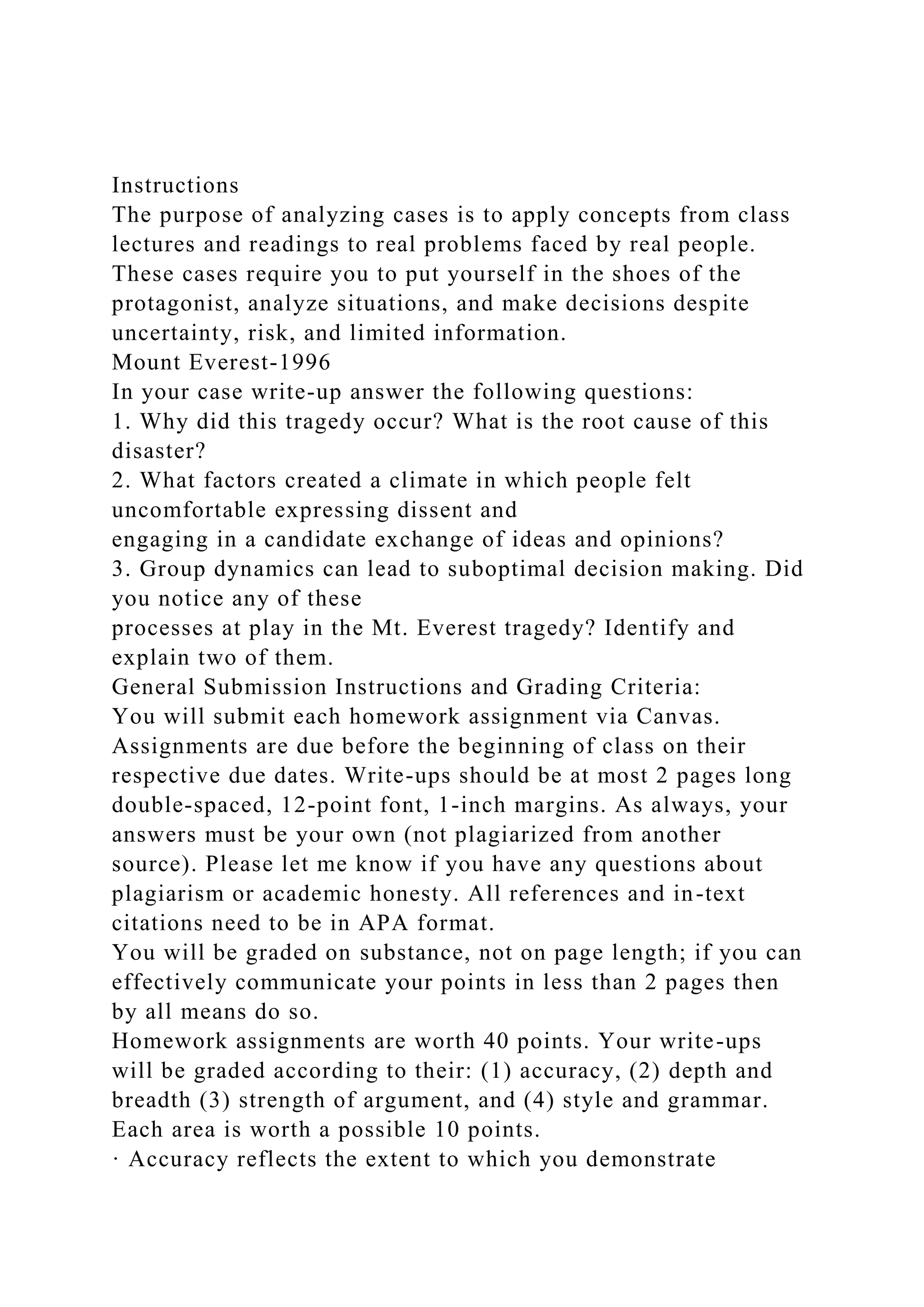 The document outlines the analysis of the 1996 Mount Everest tragedy, focusing on understanding its causes, group dynamics, and decision-making processes. It emphasizes the importance of applying course concepts to real-world problems and provides specific questions for a case write-up. The submission guidelines detail the grading criteria and the expectations for the analysis, including accuracy, depth of argument, and adherence to APA formatting.