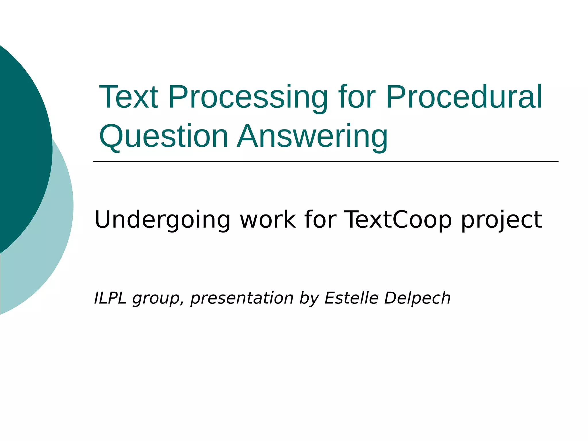 The document discusses a presentation on text processing for procedural question answering, highlighting the identification of instructional compounds and titles through a series of methods and observations. It outlines the global architecture of the processing system, including HTML cleaning and the use of various linguistic and visual clues for accurate title identification. Main issues addressed include overcoming noise from web pages and refining the hierarchy between tasks and their sub-tasks.