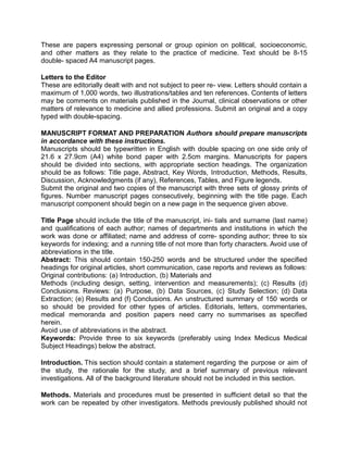 The document provides instructions for authors submitting manuscripts to the Mongolian Journal of Health Sciences. It outlines the types of contributions accepted, including original research reports, review articles, case reports, and letters to the editor. It provides guidelines on manuscript preparation, including formatting, structure, references, tables, figures, and ethics. It also describes the peer review process and categories of contributions with word count and page limits for each.
