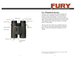 The document provides information about the Fury HD laser rangefinder binocular. It has two ranging modes - HCD (Horizontal Component Distance) which provides angle-compensated ranges for hunting, and LOS (Line of Sight) for long-range shooting. The document explains how to operate the device, set display preferences, focus the binocular and rangefinder, and offers tips for accurate ranging. Accessories like a neck strap and protective case are also included.