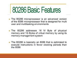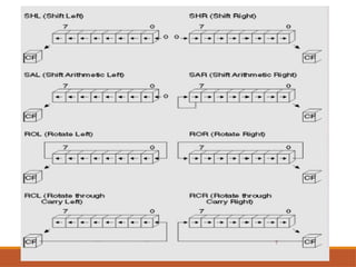 The document provides an overview of the 8086 microprocessor's instruction sets, describing the definition and structure of instructions and their associated fields. It categorizes instructions into main types, including data transfer, arithmetic, bit manipulation, and more, detailing specific instructions within these categories along with their syntax and examples. The document serves as a comprehensive guide for understanding how to utilize the 8086 instruction set effectively.