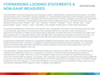 This document discusses forward-looking statements and non-GAAP measures. It notes that forward-looking statements involve risks and uncertainties that could cause actual results to differ materially from expectations. Non-GAAP measures are used in addition to GAAP measures and have limitations. Reconciliations of non-GAAP to GAAP measures are provided in an appendix. The document is intended to provide transparency around financial metrics and projections.