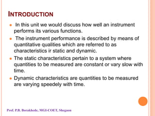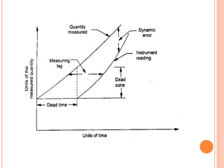 The document outlines instrument characteristics in measurement systems, focusing on static and dynamic performance. It highlights key qualities such as range, accuracy, error, correction, calibration, sensitivity, precision, repeatability, and dynamic behavior, including concepts like hysteresis and dead zones. Overall, it emphasizes the importance of understanding these characteristics to enhance the accuracy and reliability of measuring instruments.