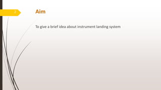 The document summarizes the instrument landing system (ILS), which provides aircraft with horizontal and vertical guidance when landing during low visibility conditions. The ILS uses radio transmitters on the ground to guide planes to runways. It consists of a localizer for lateral guidance and a glide slope for vertical guidance. Marker beacons located before the runway also help pilots judge their distance from the runway threshold. By keeping the ILS indicators centered in the cockpit, pilots can align their aircraft with the runway centerline and glide path for landing. The ILS was first tested in 1929 and helped enable safer landings in poor weather.