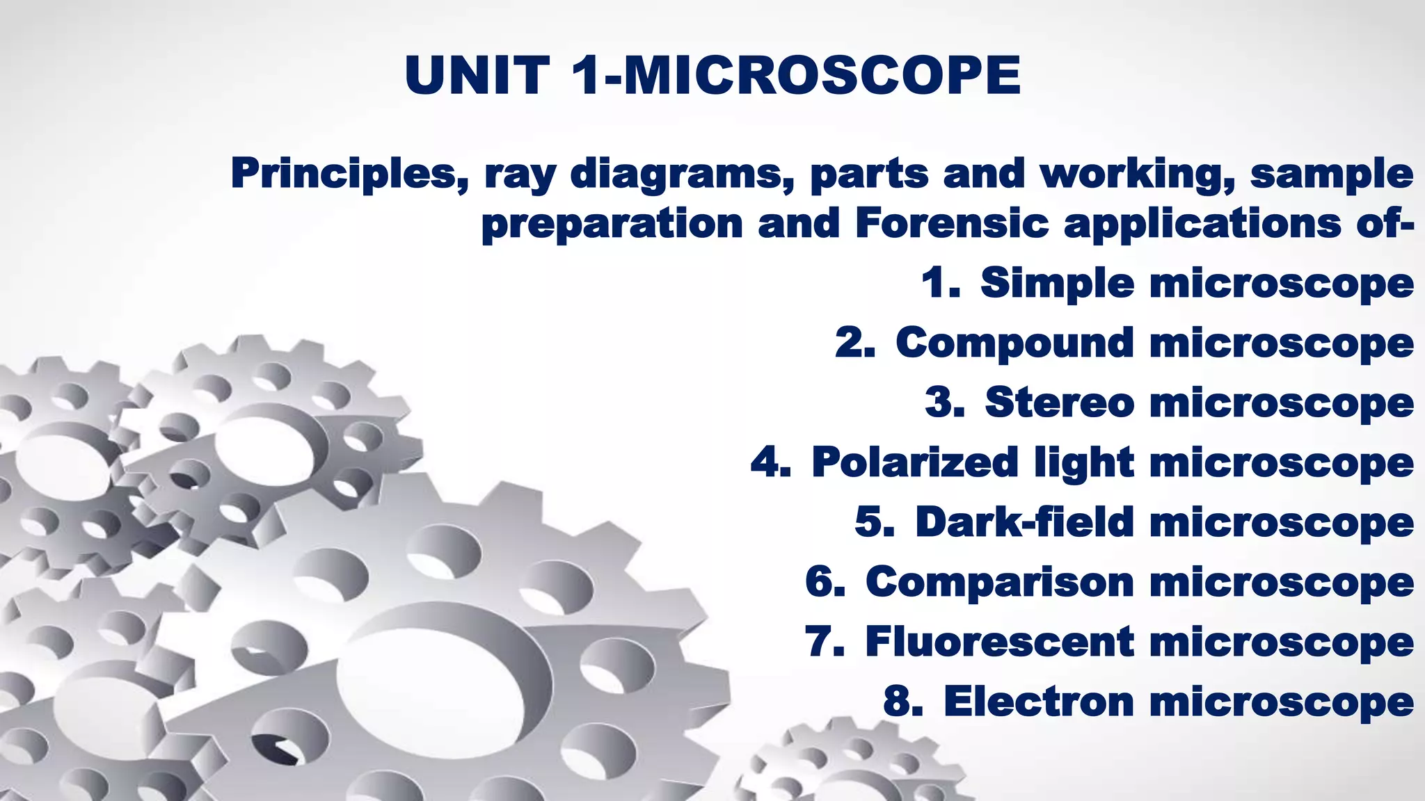 The document covers various types of microscopes and their principles, including simple, compound, stereo, polarized light, comparison, dark-field, and electron microscopes. It details the properties essential for effective microscopy such as resolution, contrast, and magnification, along with specific applications in forensic science. Each microscope type is explained regarding its working mechanism, parts, and relevance in examining small specimens.