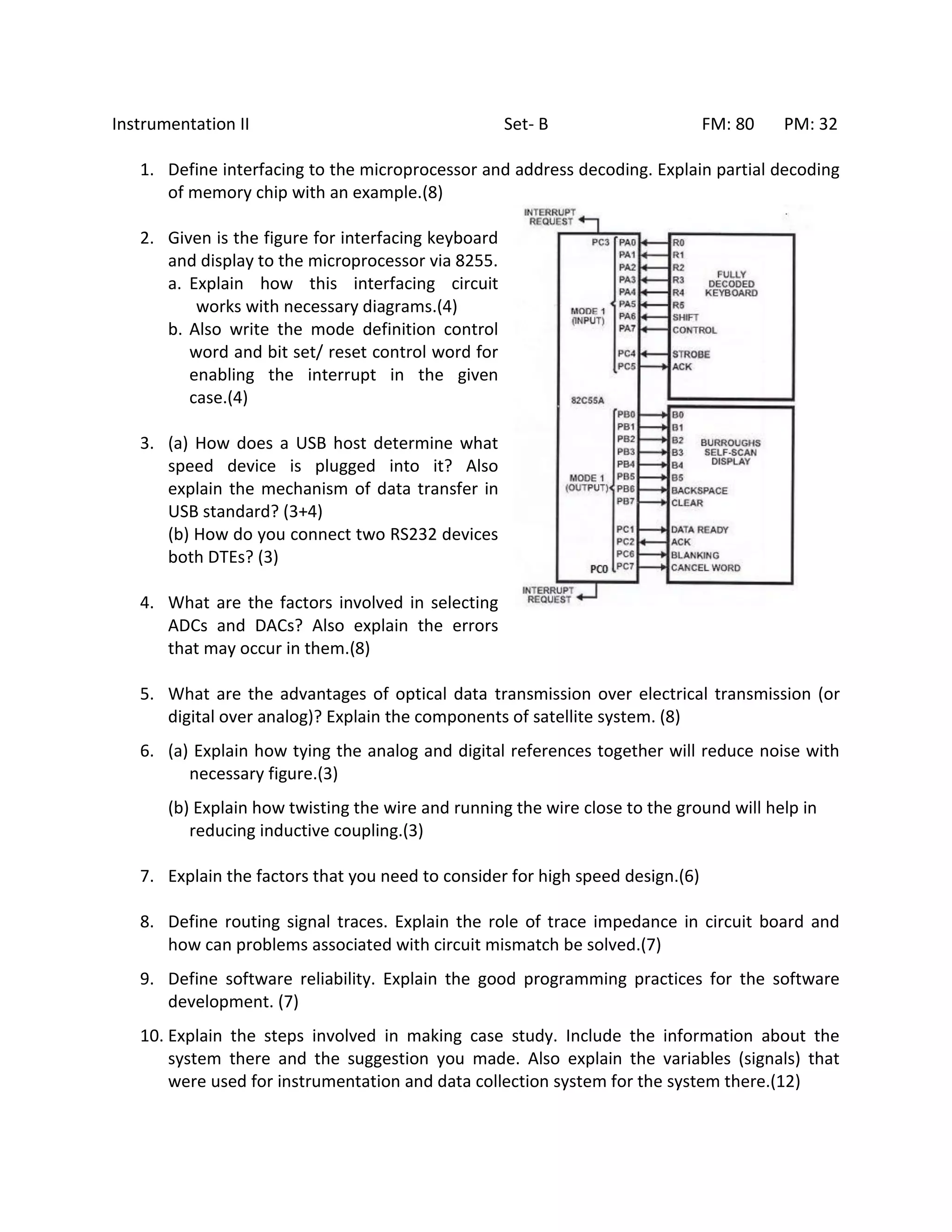 The document contains 10 questions related to instrumentation and microprocessor-based systems. Question 1 asks to draw and explain a block diagram of a microprocessor-based instrumentation system and discuss the importance of microprocessors in modern industries. Question 2 asks about the role of the 8255 chip in microprocessor systems and benefits of PCI over ISA. Question 3 defines RS-232 signals and explains simplex and half-duplex connections. The remaining questions cover topics like ADCs, Bluetooth, electrostatic discharge, signal propagation, crosstalk, software development models, process control systems, interfacing, USB, DACs, optical data transmission, reducing noise and interference, high-speed design, trace impedance, software reliability, and