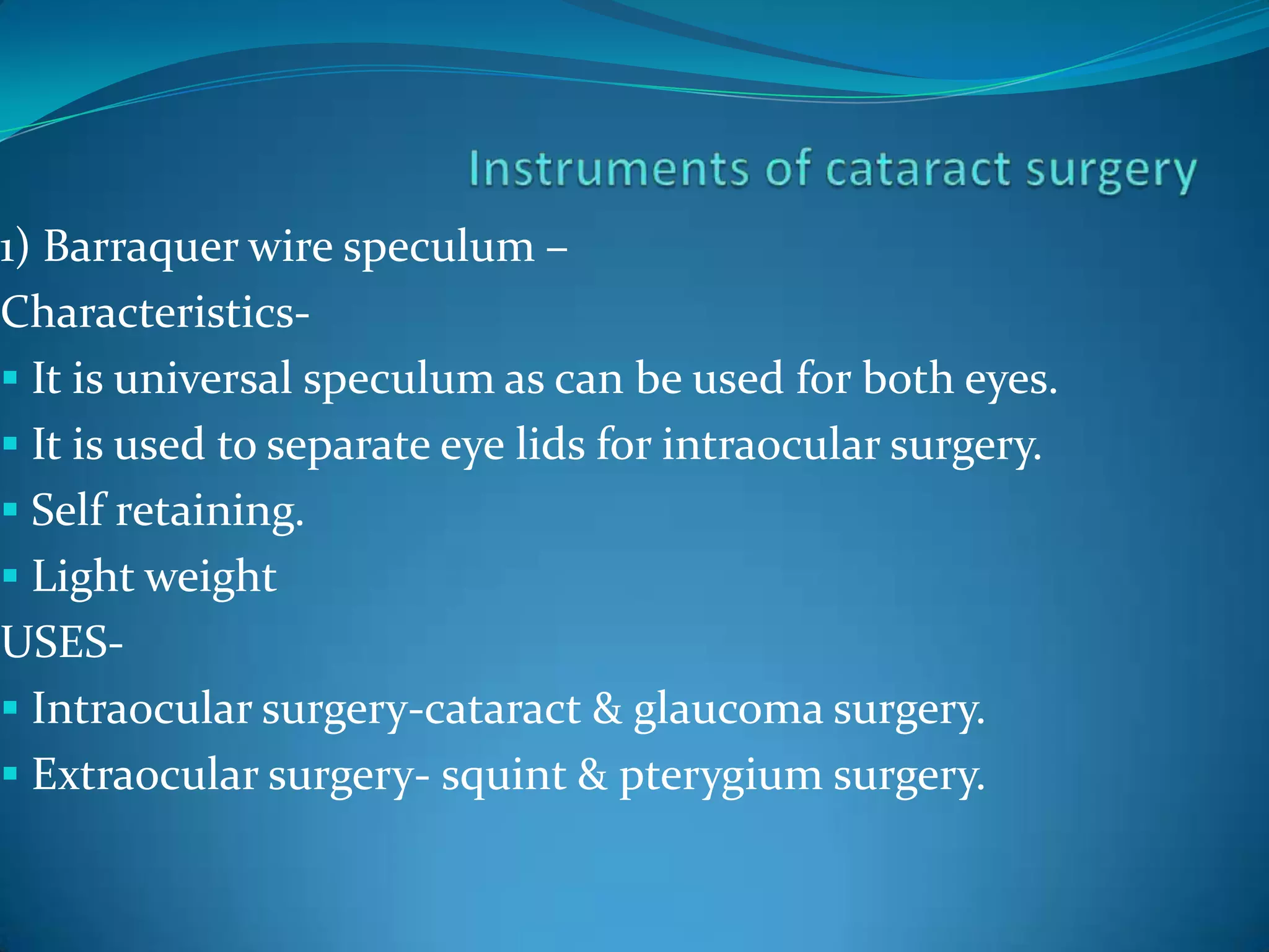 This document describes various instruments used in cataract and lacrimal surgery. It provides details on the characteristics and uses of instruments such as the Barraquer wire speculum, superior rectus holding forceps, conjunctival spring scissor, globe fixation forcep, electrocautery, Bard Parker knife, crescent knife, keratome, cystitome, Kelman-McPherson forceps, lens expressor, irrigation wire vectis, Simcoe's two way irrigation and aspiration canulla, lens holding forcep, Sinskey hook, ring capsule polisher, trephines, Citelli's bone punch, chisel, punctum dilator, and lacrimal probe. These