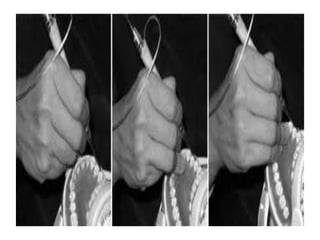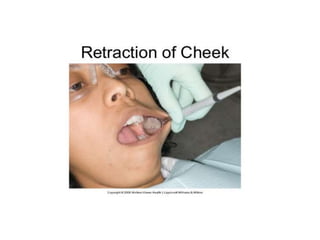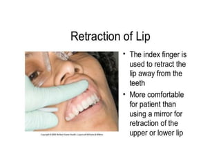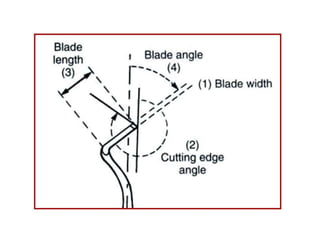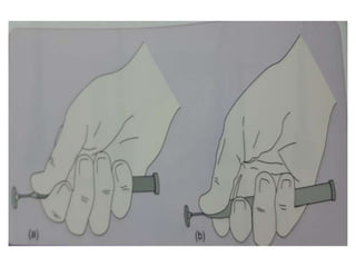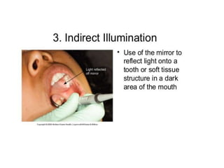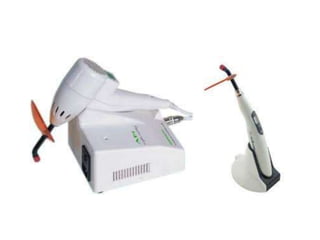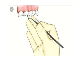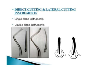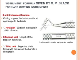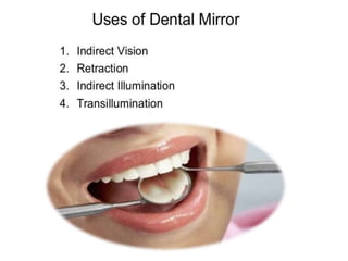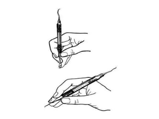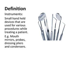 This document defines and classifies dental instruments and equipment. It discusses the materials used to manufacture instruments, such as carbon steel, stainless steel and carbide inserts. Instruments are classified based on usage into exploratory, cutting, and non-cutting restorative instruments. Exploratory instruments include mirrors, probes and tweezers. Cutting instruments comprise excavators, chisels and burs. Non-cutting instruments involve spatulas, carriers, condensers and carvers. The document also describes instrument parts, designs, nomenclature and recommended grasps.