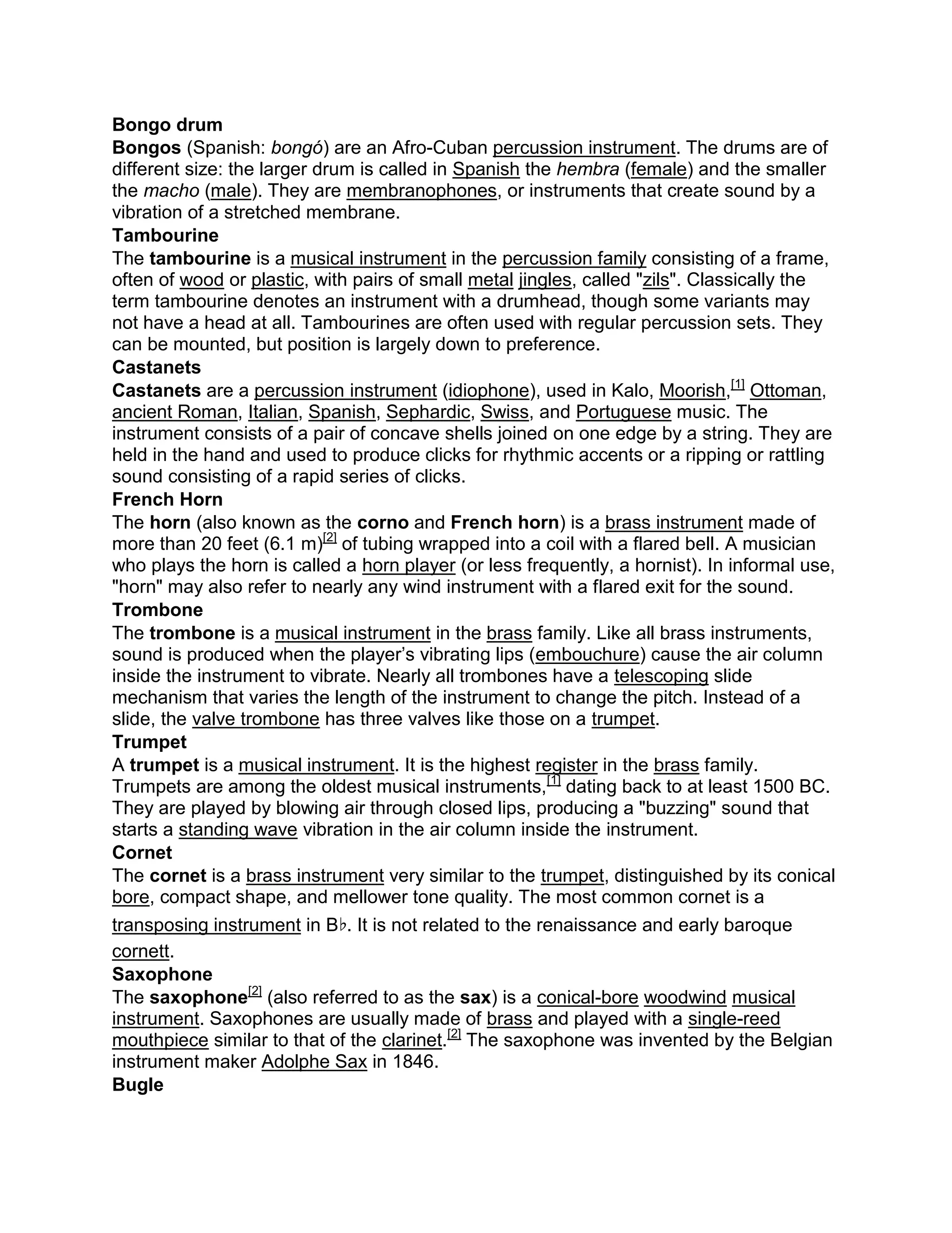 - Other instruments described are the French horn, trombone, trumpet, cornet, saxophone, bugle, accordion, banjo, tuba, English horn, piccolo, clarinet, oboe, electric guitar, acoustic guitar, and bass guitar.