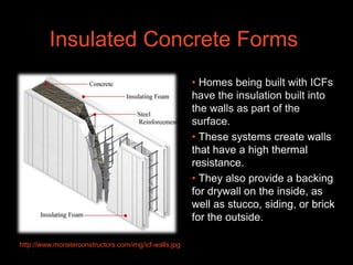 Insulated concrete forms (ICFs) are rigid foam forms that hold concrete during curing and remain in place as insulation for concrete walls. ICF walls have high thermal resistance and provide backing for interior and exterior finishes. ICF construction yields very strong, energy efficient, and quickly built walls that are ideal for resisting hurricanes, tornadoes, and wildfires. Different ICF systems create walls with varying concrete thickness patterns. While ICF material and installation costs more initially than traditional framing, the walls provide long-term energy savings and protection.