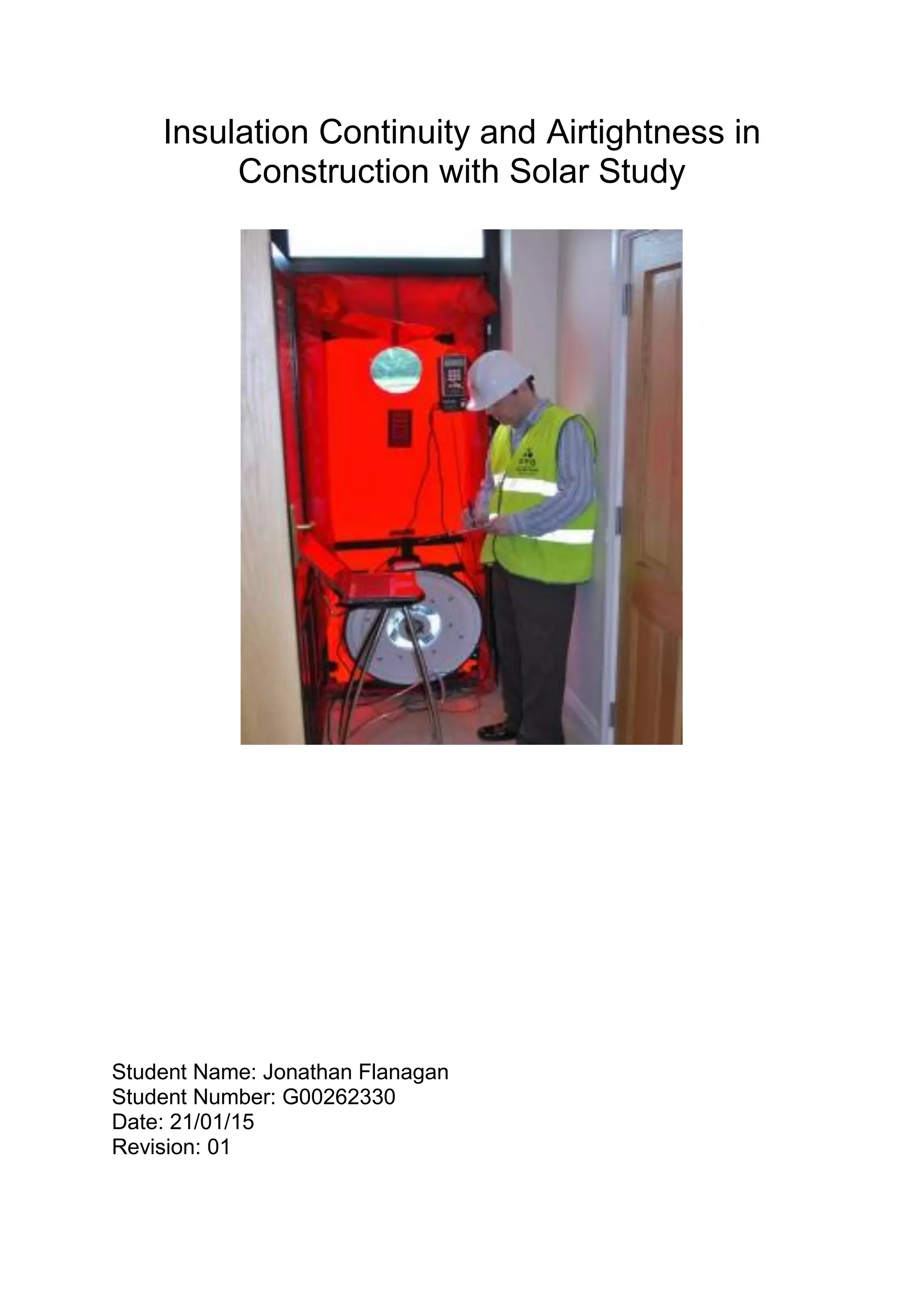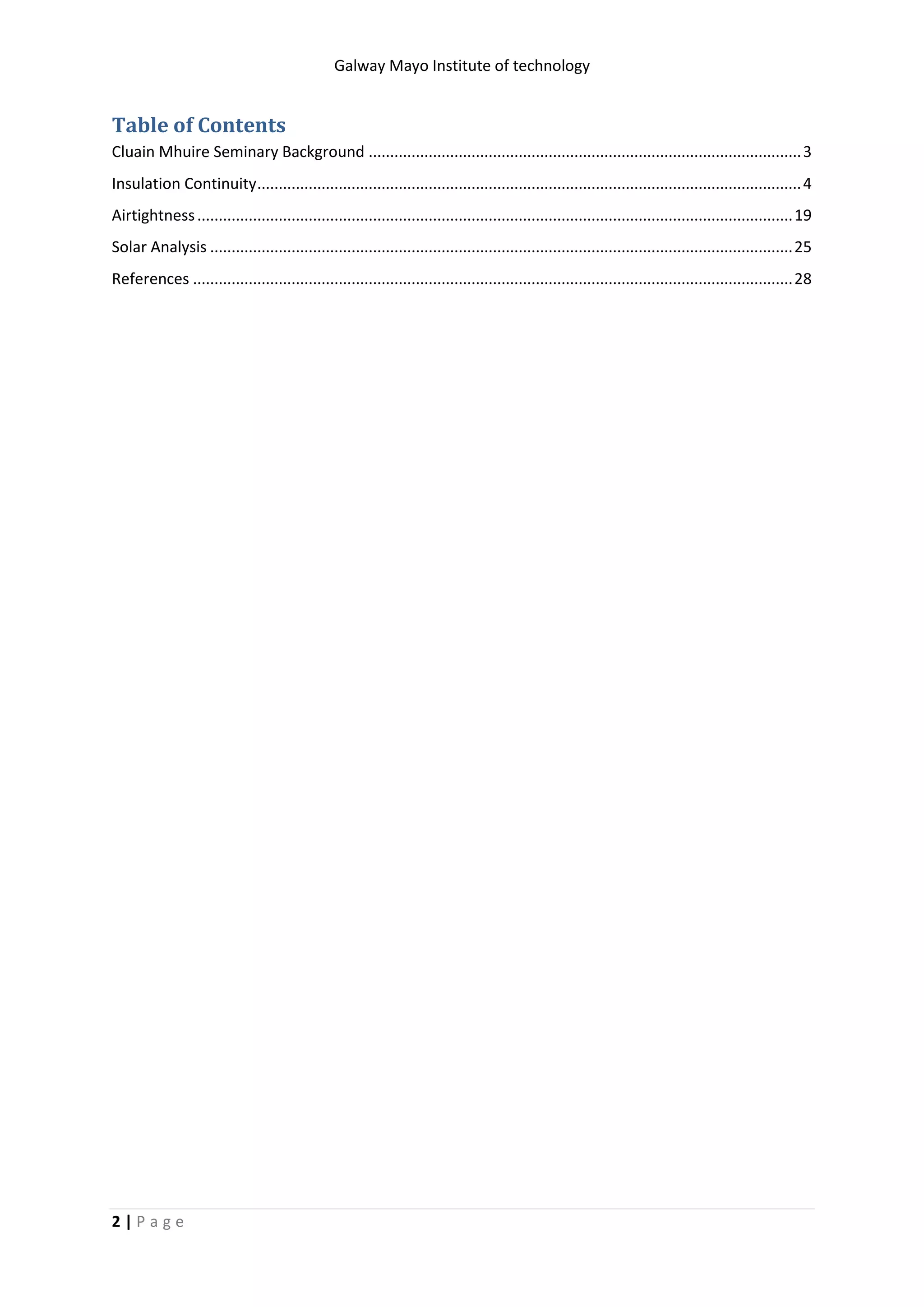 This document provides background information on Cluain Mhuire Seminary and analyzes options for improving insulation continuity and airtightness. It describes the existing building, outlines requirements for U-values and insulation types, and models wall builds using Aspen Aerogel Spaceloft, Gutex Multitherm, and Calsitherm Climate Board insulation to achieve suitable U-values. A solar analysis will also be included to improve energy standards as part of retrofitting the protected structure.