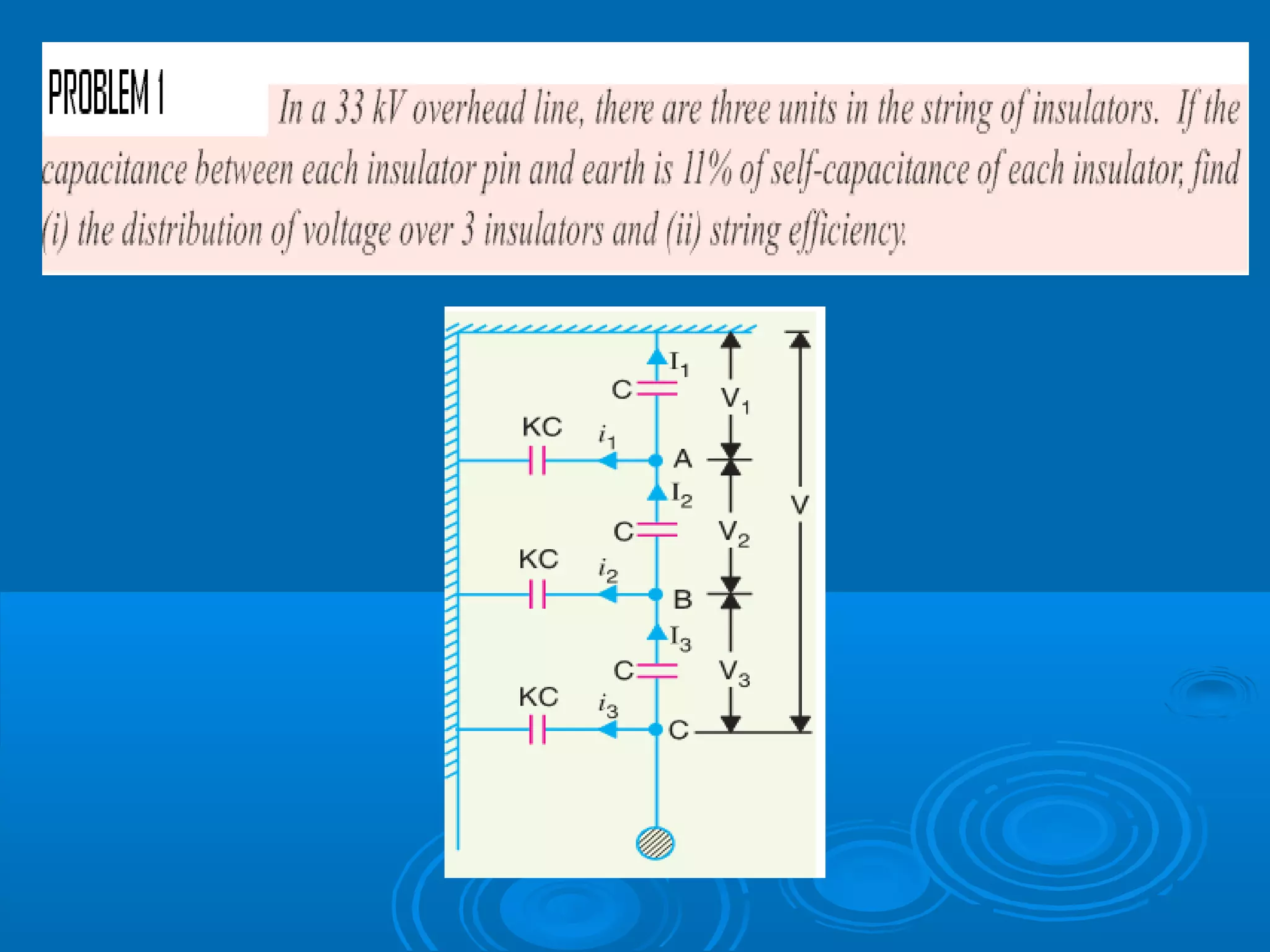 - Problem 1 defines the equivalent circuit and variables. Problem 2 calculates ratios using the 8kV and 11kV potentials across units. Problem 3 finds the line to neutral voltage assuming a shunt capacitance ratio. Problem 4 calculates string efficiency when a guard ring increases the lowest unit's capacitance to the line.