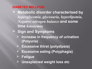 This document discusses diabetes mellitus, including its signs, symptoms, types, and complications. It also covers the physiology of insulin production and secretion by the pancreas, as well as the mechanisms and effects of insulin. Different insulin preparations are described based on source, onset and duration of action. Guidelines for insulin administration and considerations for special cases and drug interactions are provided.