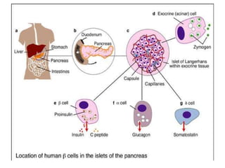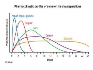 Insulin is a hormone produced by beta cells in the pancreas that regulates blood glucose levels. There are different types of insulin classified by source and duration of action that are used to treat diabetes, from fast-acting to long-lasting varieties. Insulin administration through injection or pump must be carefully titrated to each patient's needs and lifestyle to control blood sugar without causing hypoglycemia. Complications can arise from improper insulin dosing or resistance.