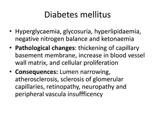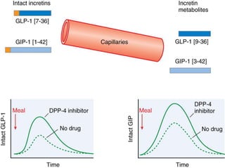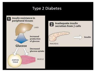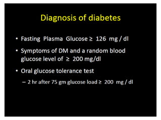 Diabetes is a condition characterized by hyperglycemia resulting from issues with insulin production or action. It can lead to pathological changes in tissues and complications like retinopathy, neuropathy, and cardiovascular disease. Insulin is a hormone produced in the pancreas that regulates glucose metabolism. It works by increasing glucose uptake and storage and inhibiting gluconeogenesis and lipolysis. Different insulin preparations have been developed with varying durations of action. Treatment of diabetes involves restoring normal metabolism through insulin administration and preventing complications.
