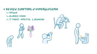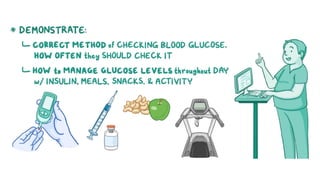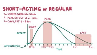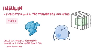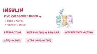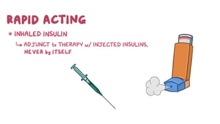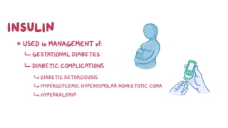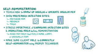 This document provides information about different types of insulin, including their classification, mechanisms of action, indications, routes of administration, side effects, contraindications, assessment and monitoring considerations, and important points for patient education. It discusses rapid-acting, short-acting, intermediate-acting, and long-acting insulins. The key points are that insulin works by stimulating glucose uptake and use, is used to treat diabetes and its complications, is administered via subcutaneous injection or intravenous routes, and careful monitoring and education of patients is important to safely manage insulin therapy and avoid hypoglycemia or hyperglycemia.