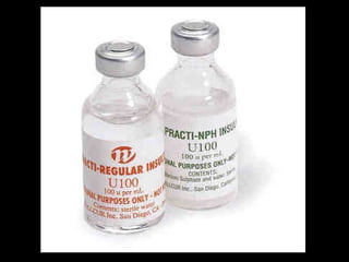 Treatment of Type 1 Diabetes mellitus involves lifelong insulin administration. Insulin is produced in the pancreas and regulates blood glucose levels. Type 1 diabetes results from autoimmune destruction of insulin-producing pancreatic beta cells leading to complete insulin deficiency. Various insulin preparations have been developed with differing durations of action to mimic normal insulin secretion. Treatment involves calculating total daily insulin dose and dividing into short and long-acting insulins administered multiple times daily. Adverse effects and methods to overcome insulin resistance are also discussed.