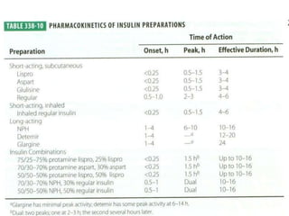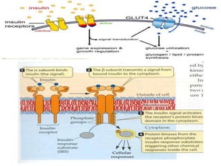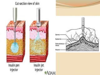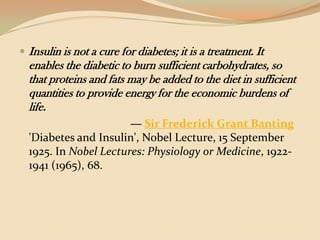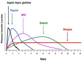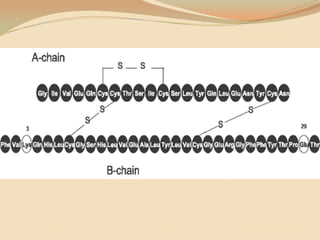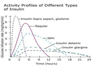 Insulin is a hormone produced by the pancreas that regulates blood sugar levels. It allows the body to use and store carbohydrates from food. Without enough insulin, blood sugar levels rise and a person develops diabetes. There are different types of insulin that work in various timeframes to mimic the body's natural insulin release and keep blood sugar stable. Insulin is essential for diabetes treatment but requires careful dosing to avoid hypoglycemia from too much insulin or hyperglycemia from too little insulin. New delivery methods like insulin pens and pumps aim to more closely match a person's changing insulin needs.