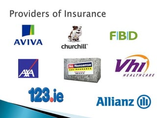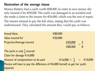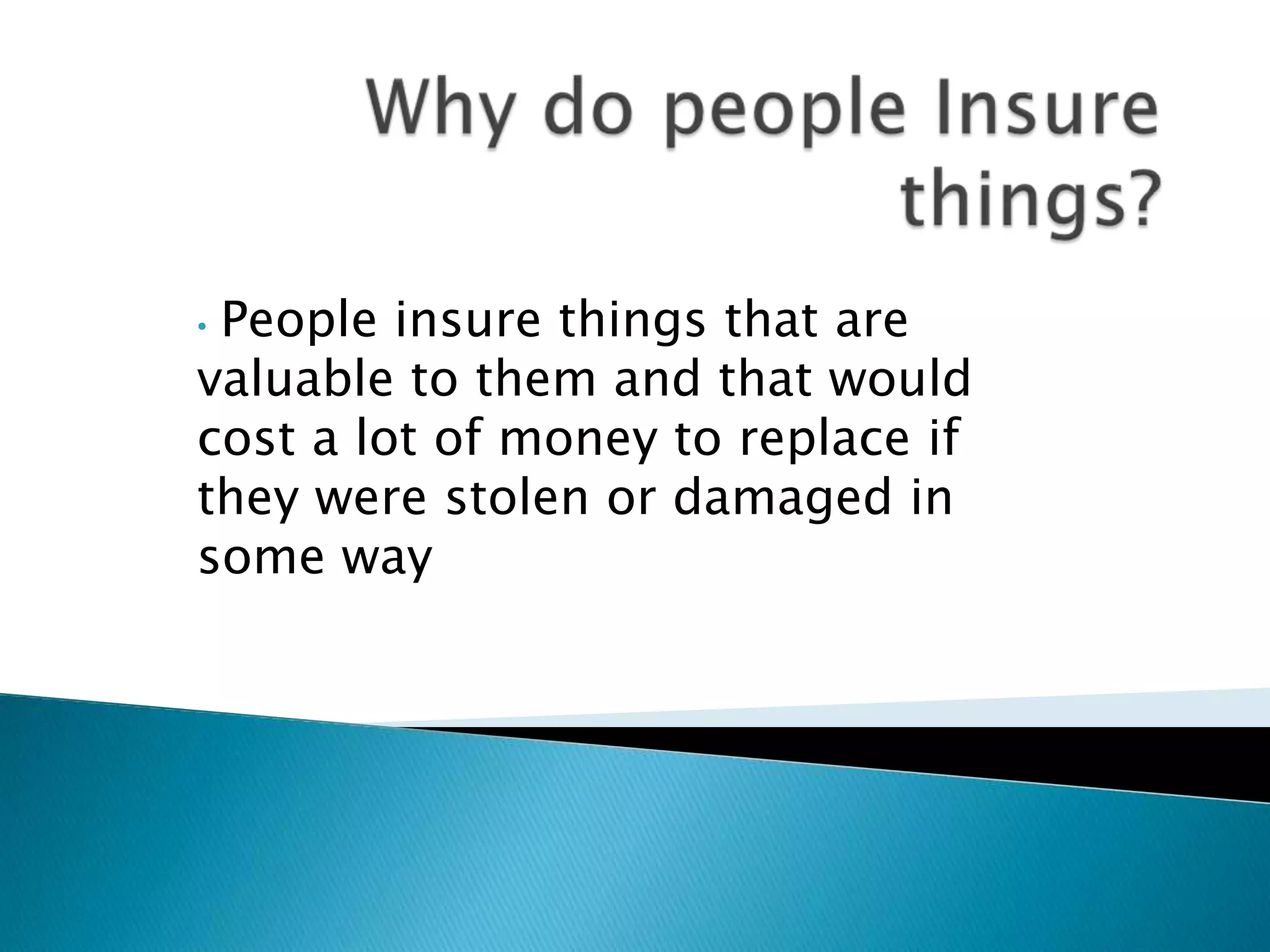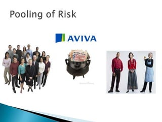 Insurance protects individuals and businesses from financial loss by paying compensation for damage to or loss of property and for legal liability resulting from negligence or injury to other people. It works by pooling risks among many insured entities, collecting fees from those insured and paying out claims to those who suffer losses from pooled risks. There are several principles that govern insurance, including insurable interest, utmost good faith, indemnity, contribution, subrogation and average clause.