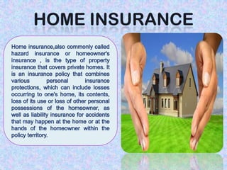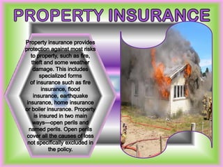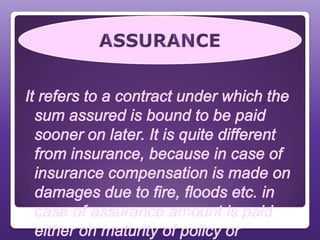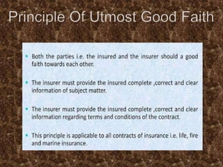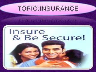 This document provides an overview of the insurance industry in India. It discusses key concepts like the insurer, insured, and policy. It outlines the history of insurance in India dating back to 1850 and the nationalization of insurance companies in 1956. It also describes the main types of insurance like life, fire, marine, and general insurance as well as principles of insurance such as insurable interest, indemnity, and mitigation. The advantages of insurance for protection, investment, and industrial development are highlighted.