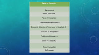 This document provides an overview of the insurance sector in Bangladesh. It discusses the history and types of insurance, including life, property, fire, marine, and motor insurance. It outlines the economic role of insurance and analyzes the scenario and problems facing the insurance industry in Bangladesh, such as a lack of public awareness, political instability, and insufficient training. Finally, it offers recommendations on how insurance companies can improve, including better education, marketing strategies, and addressing economic and management issues.