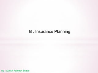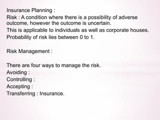 This document provides an overview of insurance planning and various insurance concepts. It discusses risk and risk management, the concept of insurance, principles of insurance including utmost good faith, insurable interest, and indemnity. It also covers types of insurance policies for life and general insurance, products, tax benefits, underwriting, and claims processes. Key terms related to insurance are defined throughout the document.