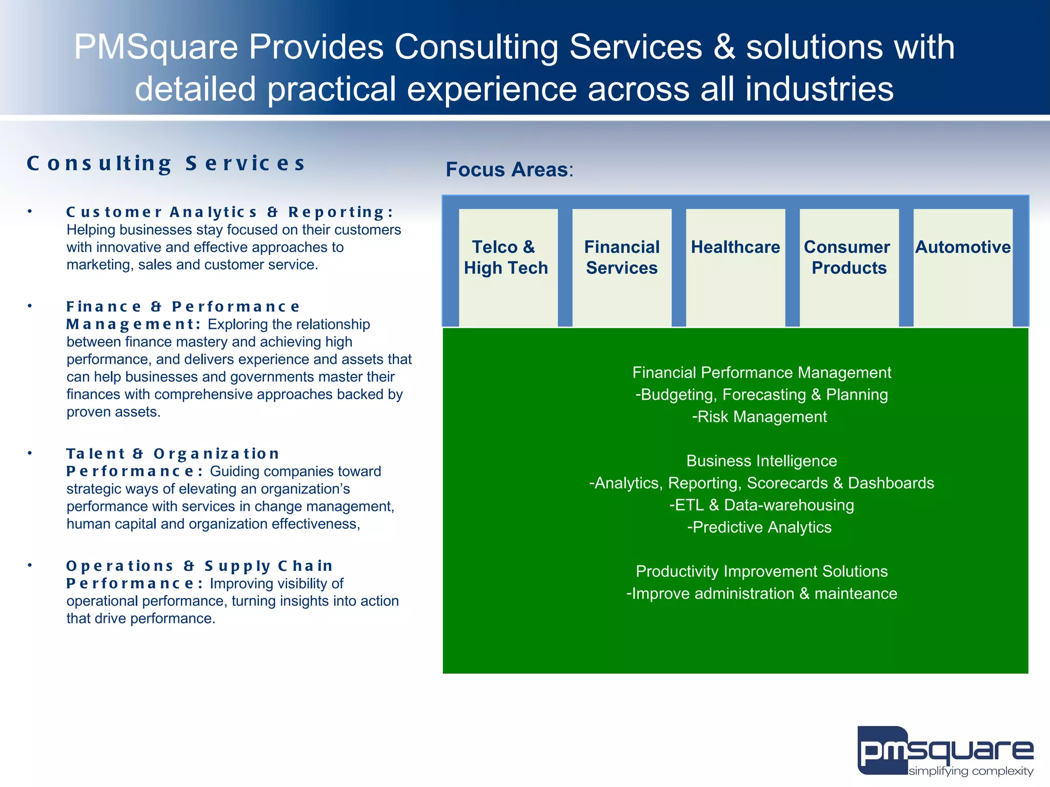 PMSquare provides consulting services and solutions across various industries, focusing on customer analytics, finance/performance management, talent/organization performance, and operations/supply chain performance. The document also summarizes an insurance sales performance dashboard solution from IBM that provides key performance indicators and reports to help insurance companies track sales, revenue, productivity and performance. It includes prebuilt components like dashboards, scorecards and alerts.