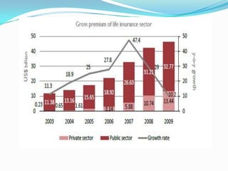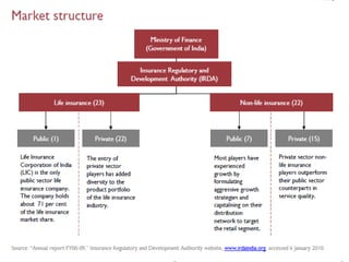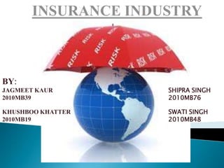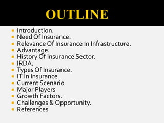 The document provides an overview of the insurance industry in India. It discusses the history and development of the insurance sector in India, including the establishment of regulatory bodies like the Insurance Regulatory and Development Authority (IRDA). It also outlines the major types of insurance available in India, key players in the life and non-life insurance sectors, as well as growth factors and challenges facing the industry. The insurance sector is poised for further growth given India's large population and increasing incomes.