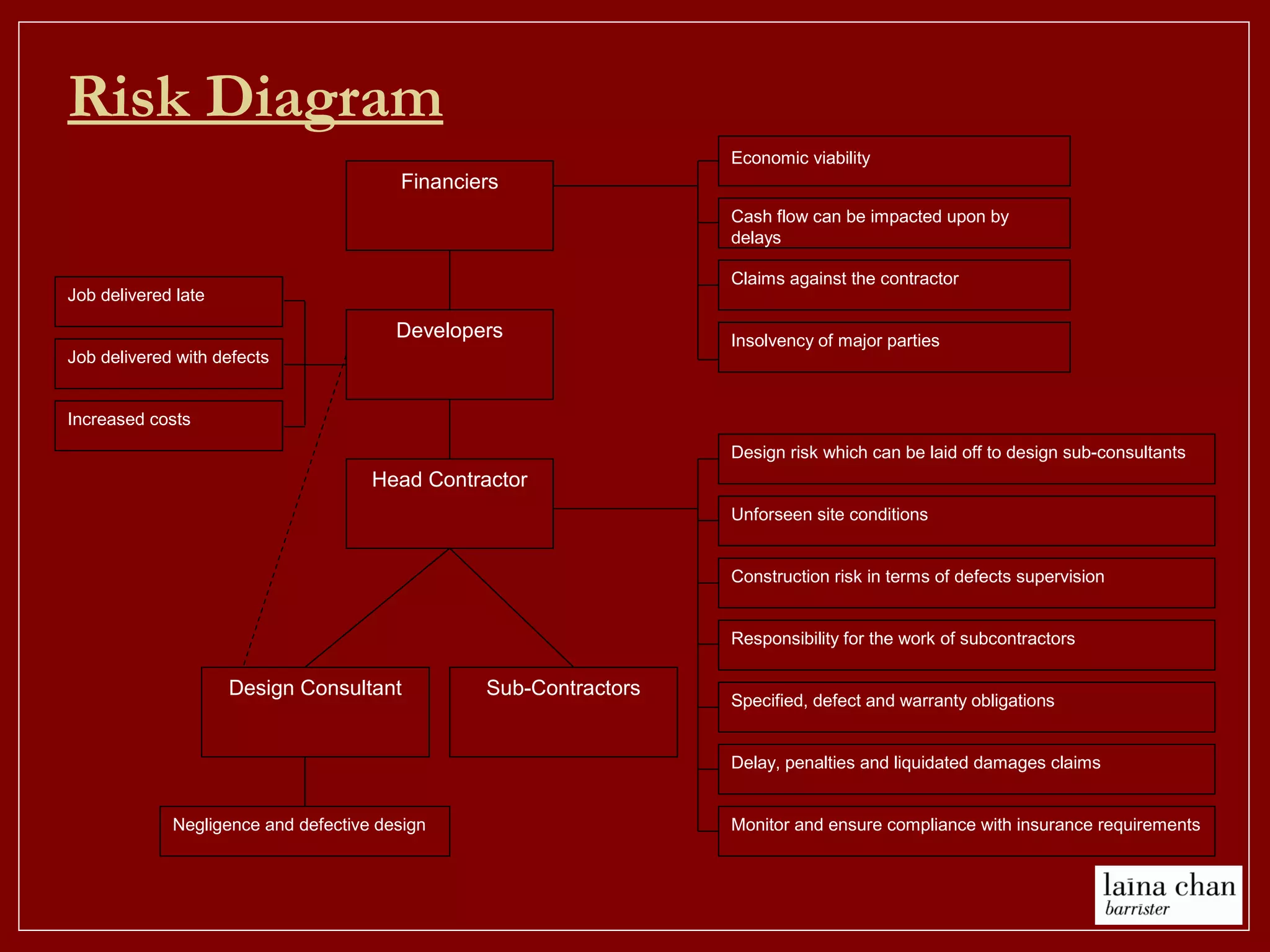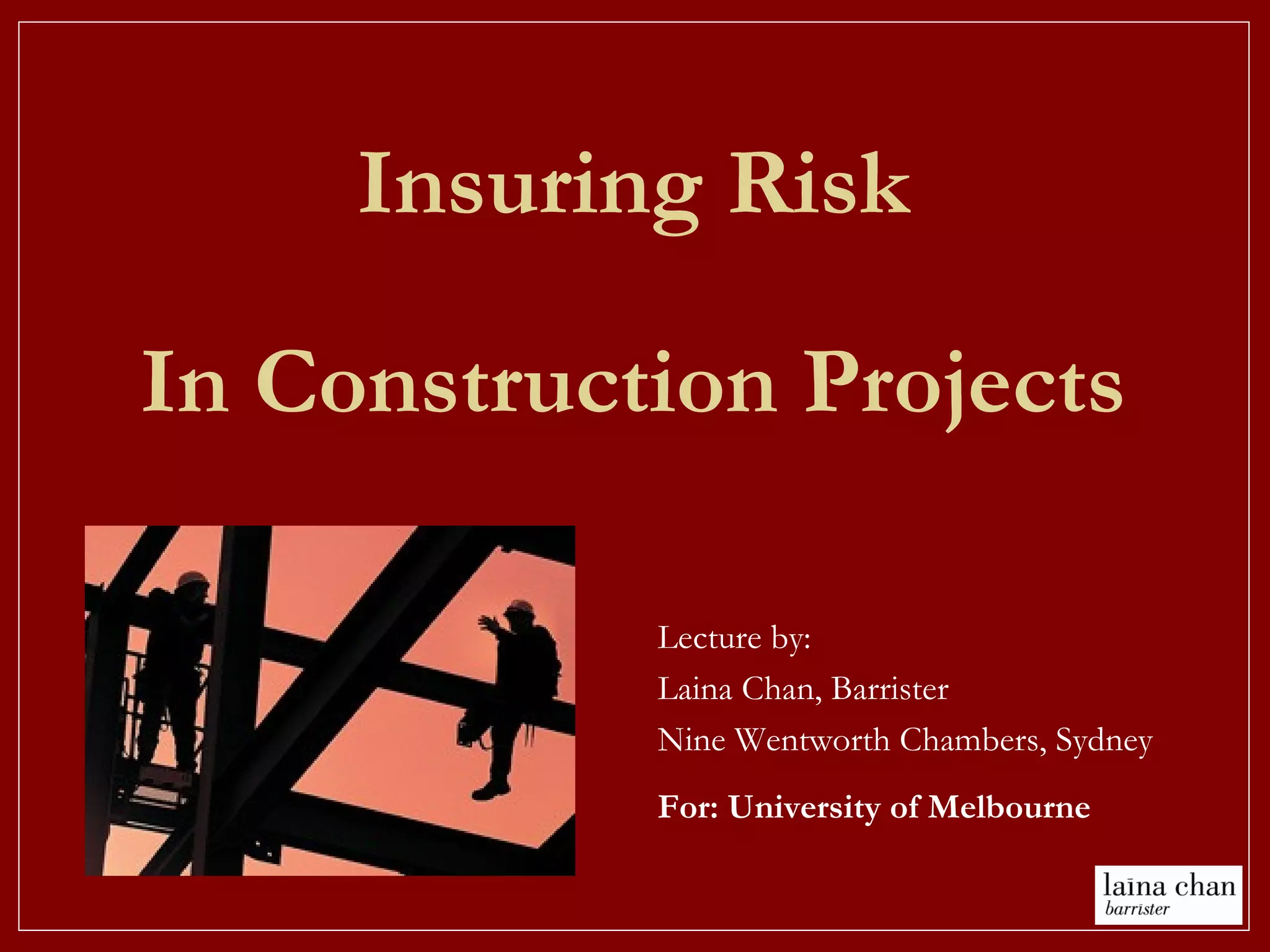 This document provides a summary of a lecture on insuring risk in construction projects. It discusses the various parties involved in construction projects and the risks they face, such as delays, claims, insolvency, design flaws, and more. It then outlines the various types of insurance commonly used in construction, including contractors' all risk policies, professional indemnity, and more. The document discusses several legal cases that relate to interpreting insurance contract clauses and exclusions. It examines issues like whether rectification costs are covered, how cross-liability and waiver of subrogation clauses work, and when insurance payouts might reduce damages owed.