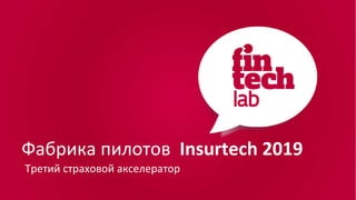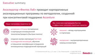 Документ описывает корпоративный акселератор 'финтех лаб', который ориентирован на запуск пилотных проектов между стартапами и страховыми компаниями за 12 недель. Программа предполагает коллаборацию, интенсивное обучение и поддержку инновационных команд с целью быстрого внедрения технологических решений в страховом секторе. Участники программы получают знания о гибких методологиях, B2B-продажах и психологии переговоров для успешной интеграции в корпоративную среду.