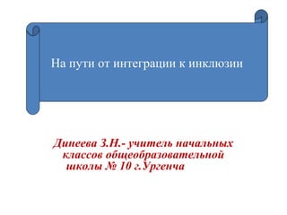 Документ обсуждает переход от интегративного к инклюзивному образованию, подчеркивая важность признания различий между детьми и их способности к обучению. Он описывает этапы и принципы создания инклюзивной культуры в образовании в Узбекистане, фокусируясь на значении участия всех детей в образовательном процессе. Основное внимание уделяется проблемам, связанным с несовершенством системы образования и недостаточной подготовленностью учителей к интеграции детей с особыми потребностями.