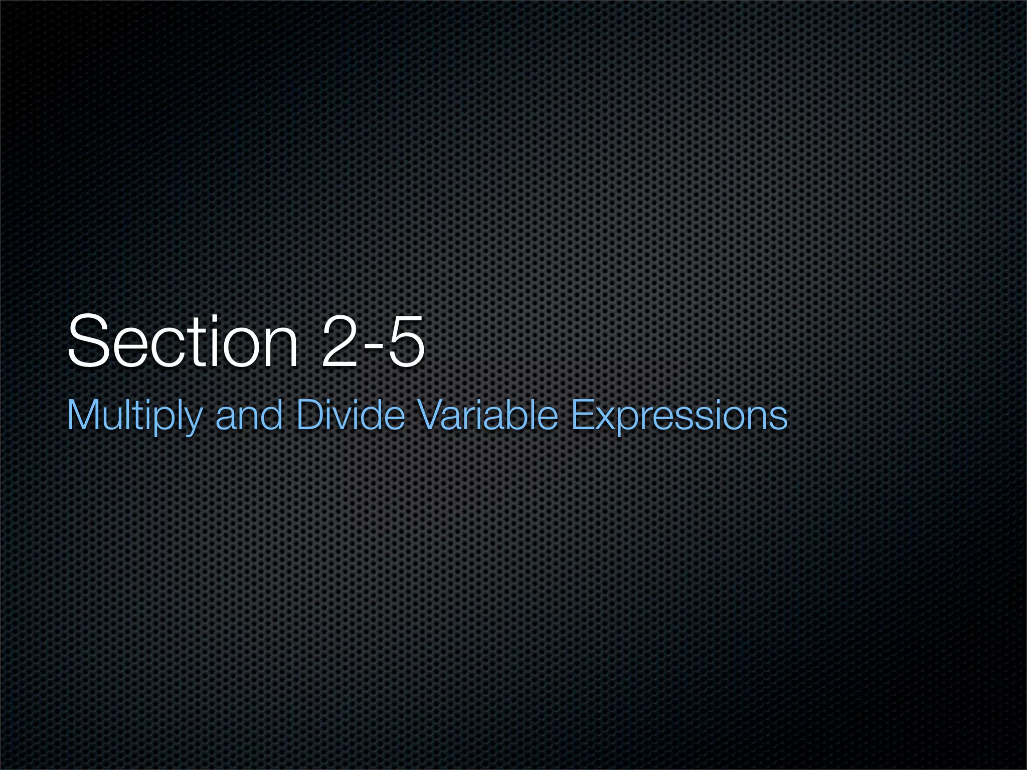 The document discusses multiplying and dividing variable expressions. It provides examples of simplifying expressions using the distributive property and the property of the opposite of a sum. It also demonstrates dividing variable expressions by writing the division as a fraction and simplifying. Key steps include distributing terms, dividing each term in the numerator by the denominator, and evaluating expressions for given variable values.