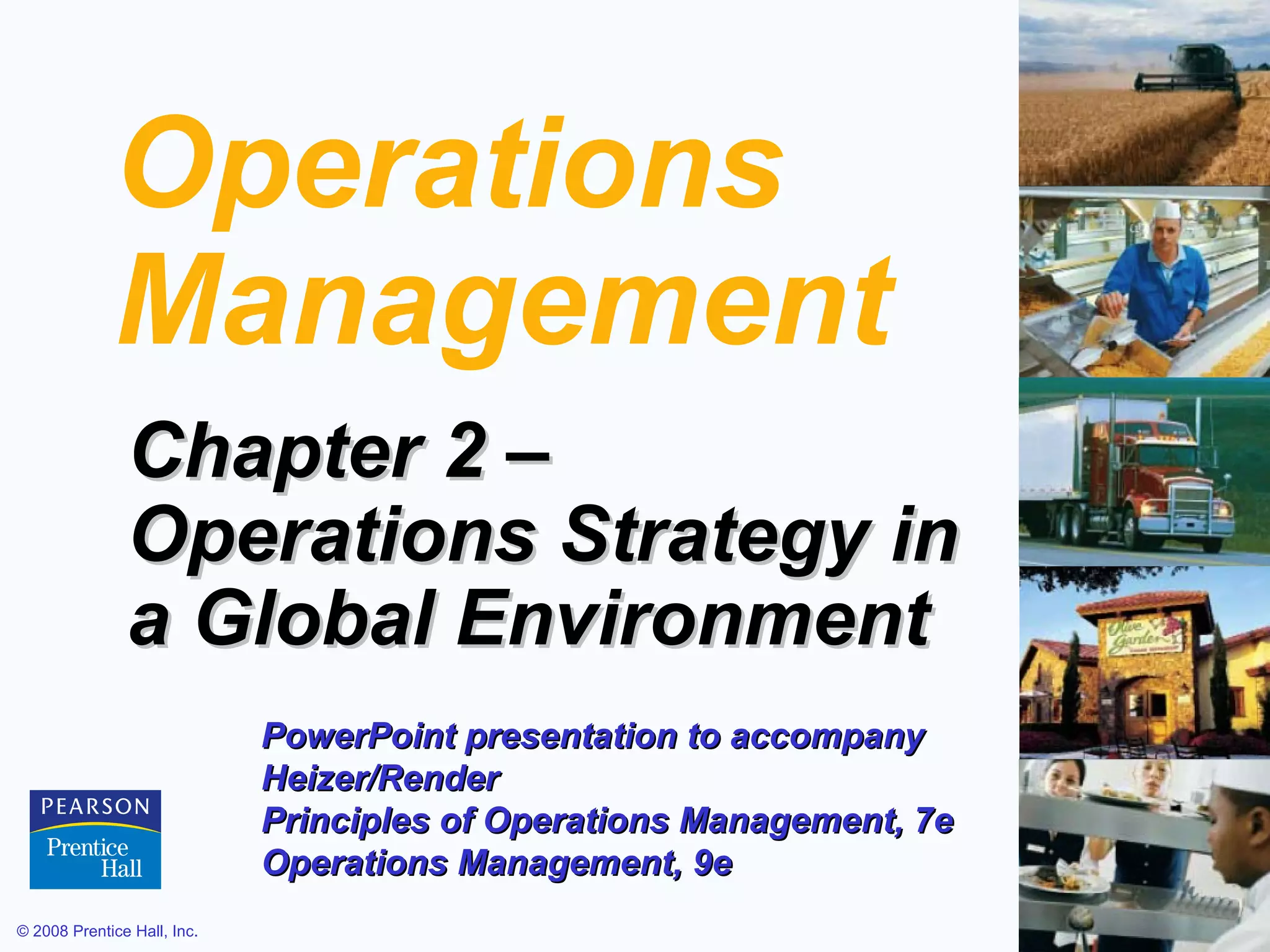 The document outlines the key topics in Chapter 2 of the Operations Management textbook, including developing missions and strategies, achieving competitive advantage, global operations strategy options, and cultural and ethical issues in global operations. It provides examples of company missions from FedEx, Merck, and Hard Rock Cafe to illustrate what a mission statement communicates. It also gives sample missions for operations management departments.