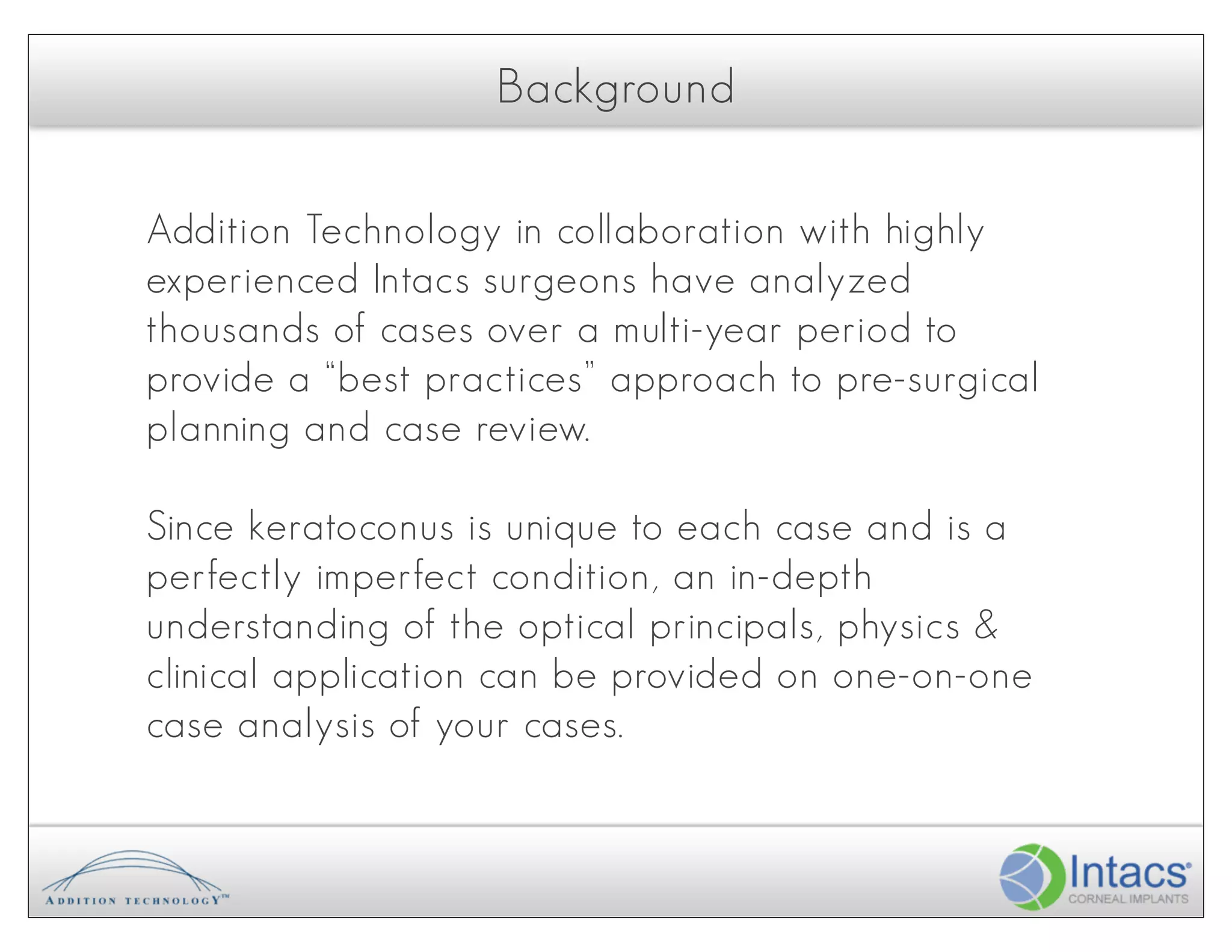 Here are additional pre-surgical case examples to review: - Patient 1: Keratoconus in both eyes, worse in right. Best corrected vision 20/60 in right, 20/40 in left. Steep cornea with thinning. Consider Intacs to flatten cornea and improve vision. - Patient 2: Asymmetric keratoconus. Left eye moderate, right eye advanced. Right eye best corrected 20/100. Consider Intacs in right eye to improve vision and stabilize further ectasia. - Patient 3: Keratoconus diagnosed 5 years ago. Wears rigid gas permeable lenses but vision fluctuates. Best corrected 20/40. Consider Intacs to improve and stabilize vision long term