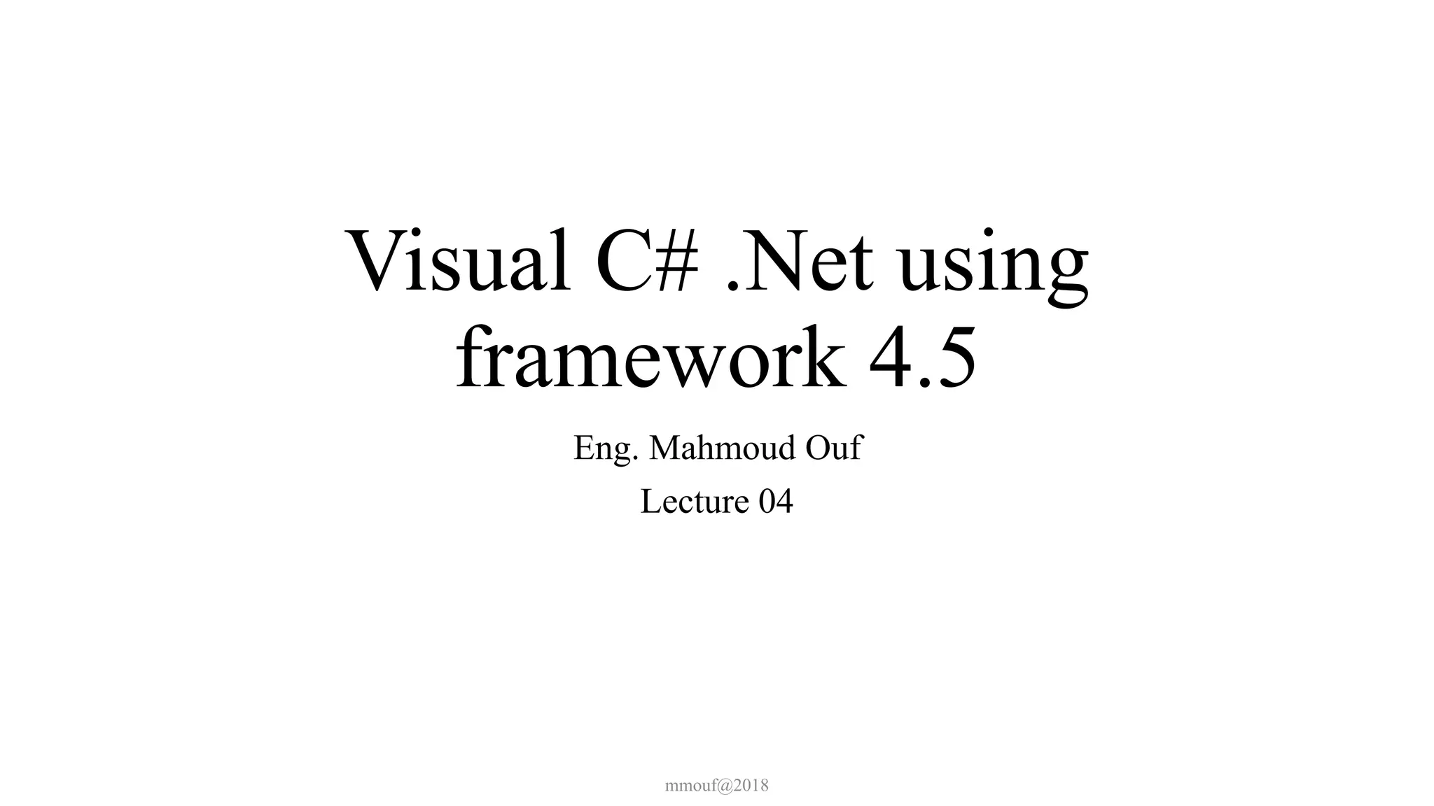 The document discusses various C# concepts related to classes and objects including constructors, inheritance, interfaces, properties, and auto-implemented properties. It provides examples of how to define classes with different types of constructors, use inheritance and overriding to extend classes, implement interfaces, and define public properties and auto-implemented properties to encapsulate data in a class.