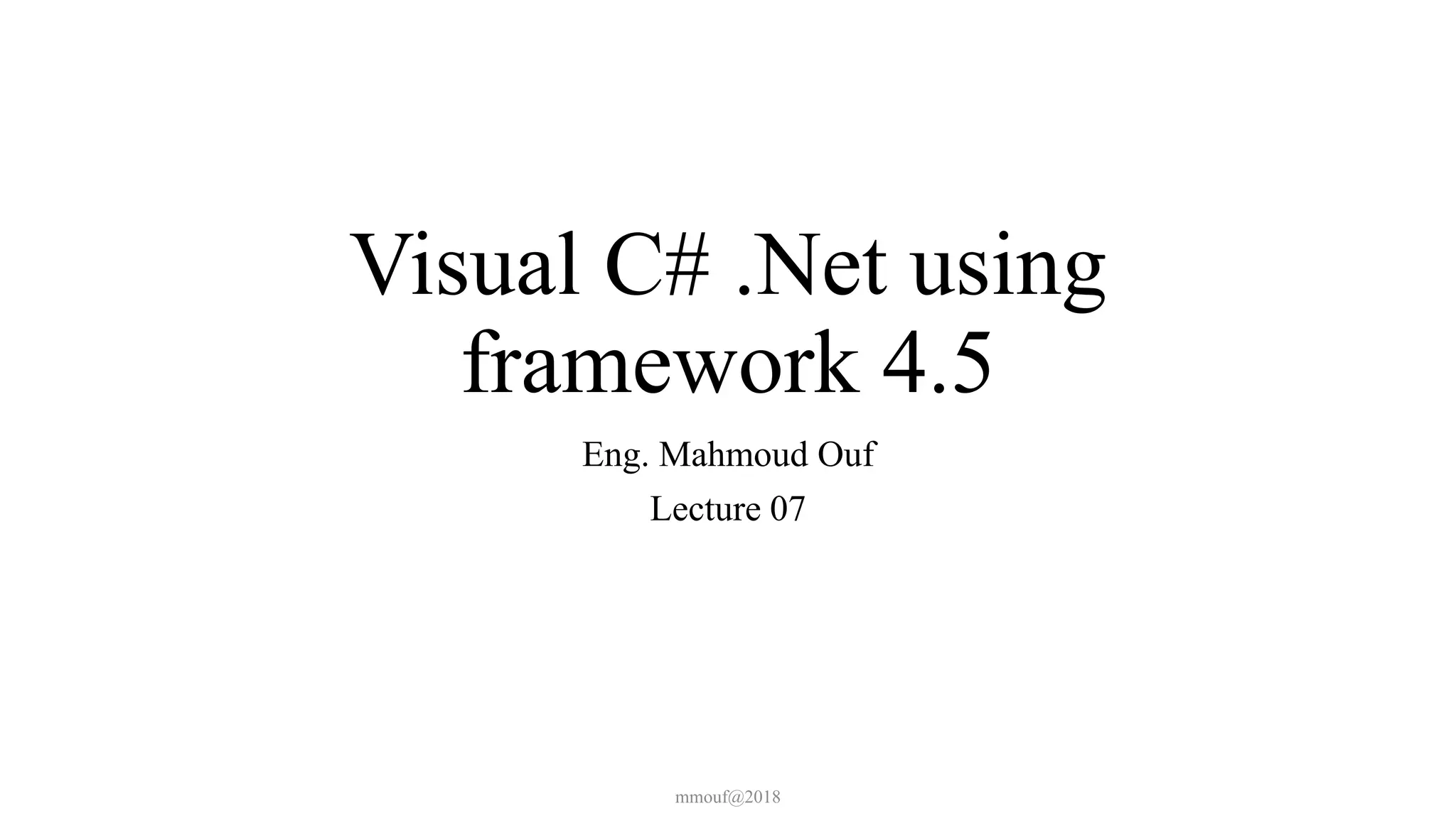 This document discusses how to handle events in Visual C# .NET framework 4.5. It explains that GUI classes have predefined events that developers implement by attaching event handlers using delegates. It then provides examples of handling events from the Form, Control, and Mouse classes, describing properties like PaintEventArgs, KeyEventArgs, and MouseEventArgs that provide information about the events. It discusses overriding methods like OnPaint, OnKeyPress, OnKeyUp, and event handler methods.