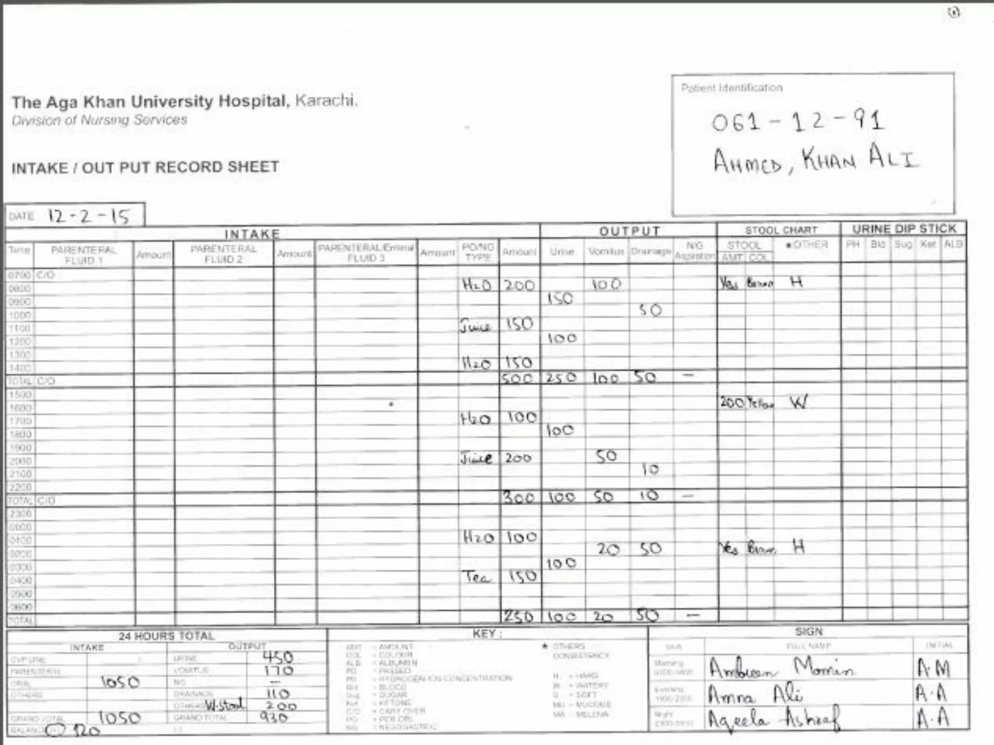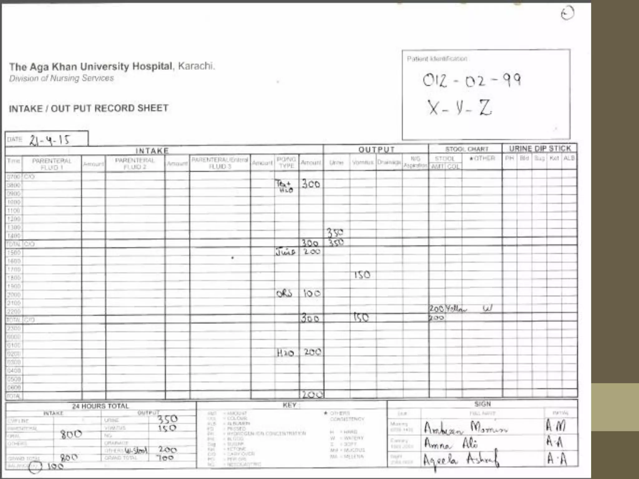 24 hours intake and output. Record the data and result in I/O Sheet provided. Please indicate that