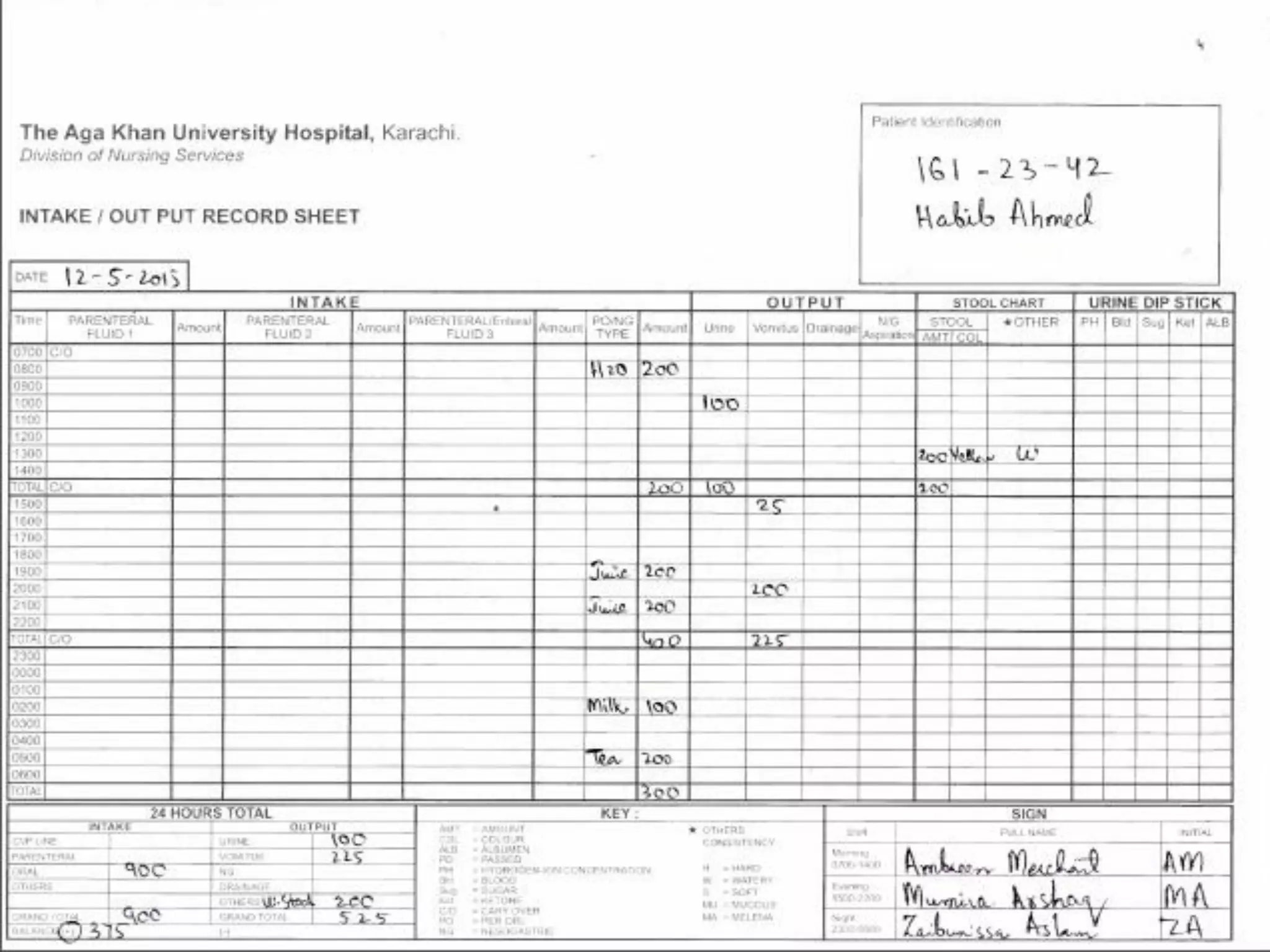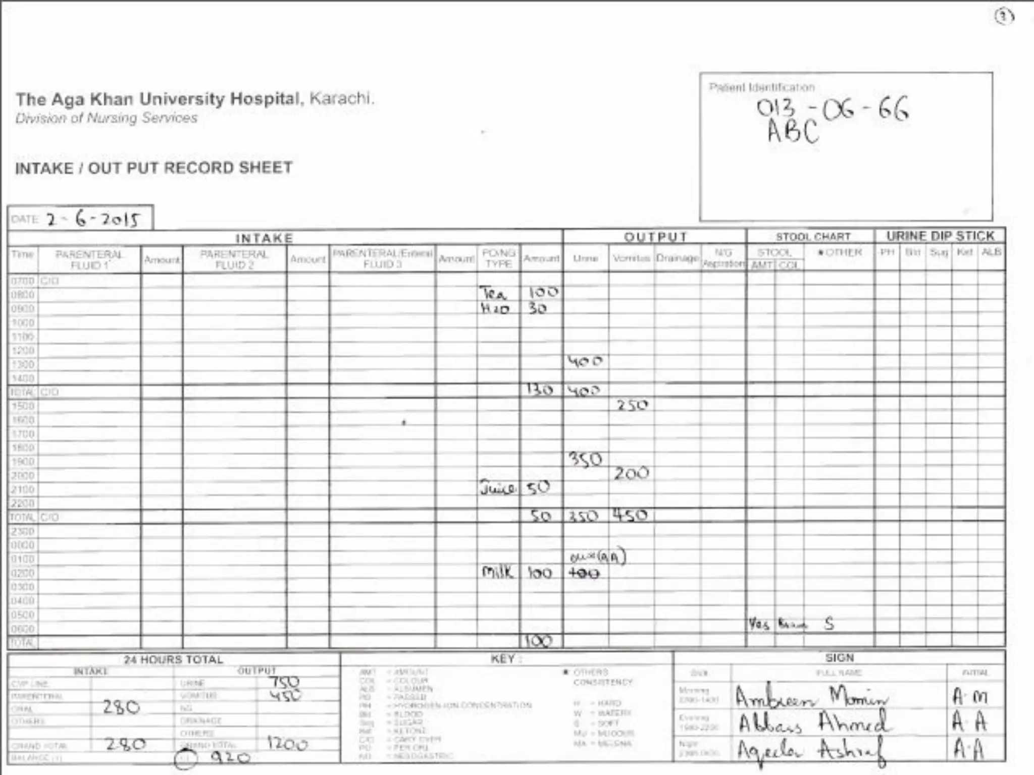 E.G : Total intake is 2000 ml and Total output is 1600 ml