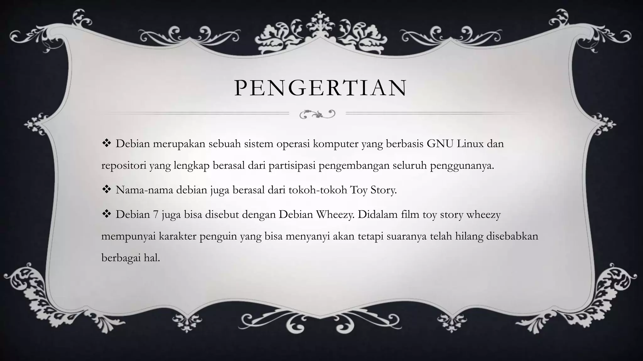 Debian adalah sistem operasi berbasis Linux yang dikembangkan secara terbuka oleh komunitas penggunanya. Dokumen ini menjelaskan proses instalasi Debian versi 7 (Wheezy) melalui beberapa tahapan seperti memilih bahasa, lokasi, konfigurasi jaringan, membuat partisi harddisk, dan memilih paket-paket yang dibutuhkan.