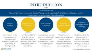 The document discusses the significance of intangible assets in the service and knowledge-based economy, emphasizing that all businesses possess intangible asset value that is often misunderstood and undervalued. It outlines misconceptions surrounding these assets, the importance of their recognition in financial statements, and practical steps to enhance their valuation for financing and shareholder value. The presentation provides insights into different types of intangible assets, their impact on enterprise value, and the challenges related to their accounting and securitization.