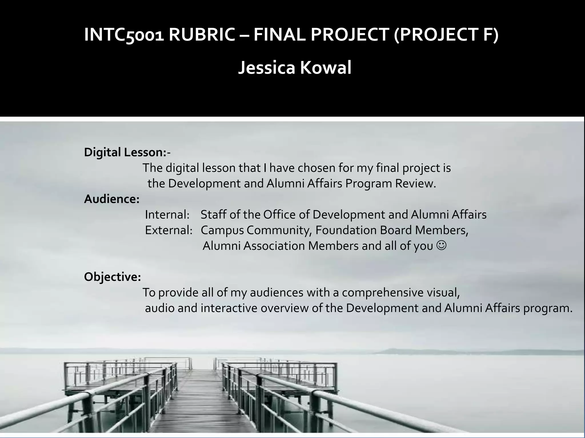 This digital lesson provides a comprehensive overview of the Development and Alumni Affairs program through an interactive PowerPoint presentation. The presentation is designed to inform internal staff and external audiences such as campus community members, foundation board members, and alumni association members. By utilizing PowerPoint's design and development features, the presentation allows audiences to learn about the program through its construction of knowledge and meaningful interactions with information and ideas.