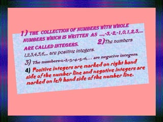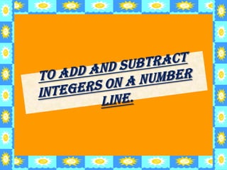 1. Cut strips of graph paper with positive integers from 1 to 10 written left to right and negative integers from -1 to -10 written right to left. 2. Paste the strips on either side of a line drawn on a sheet with the negative integers on the left and positive on the right meeting in the middle. 3. To add, move right along the number line and to subtract, move left, with examples given of adding 2 to 3 and subtracting 4 from 5.