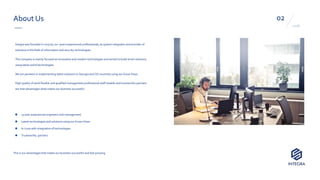 Integra was founded in 2015 and is a system integrator focused on innovative IT and security technologies. It has over 15 years of experience implementing the latest solutions in Georgia and CIS countries using professional staff and reliable partners. Integra provides services such as IT infrastructure projects, system integration, security audits, demo equipment, trainings, and works with key technology partners like Nutanix, PureStorage, and Palo Alto Networks. Some of Integra's successful projects include networking, security, and infrastructure implementations for Casino Eclipse, Casino Princess, and the Merani Business Centre.