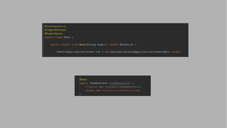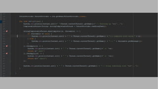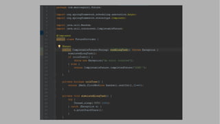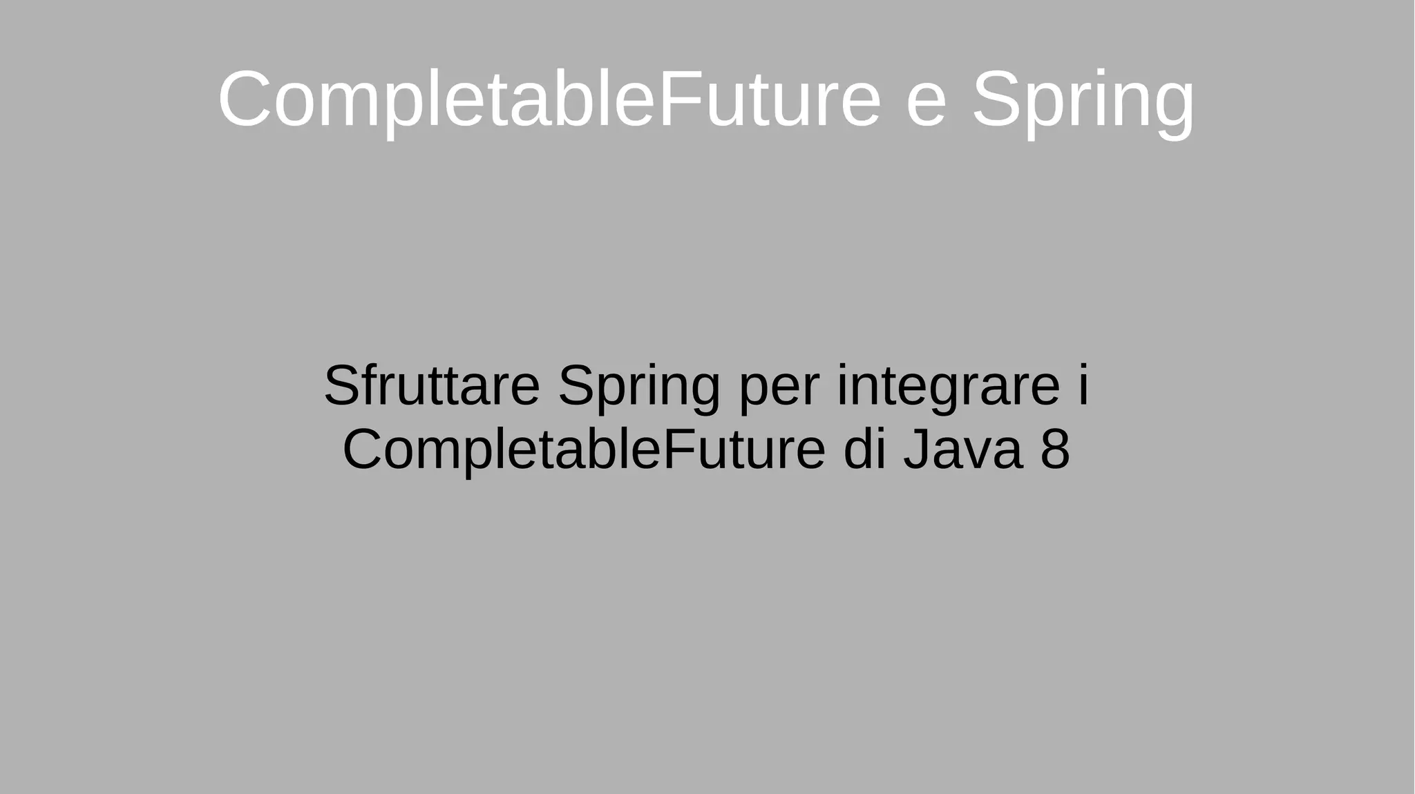 Il documento descrive come integrare CompletableFuture di Java 8 con Spring, coprendo configurazione Maven, avvio del contesto e utilizzo di un componente per chiamate onerose. Vengono spiegate le annotazioni necessarie per il contesto e l'esecuzione asincrona, così come le differenze tra l'uso di SimpleTaskExecutor e ThreadPoolTaskExecutor per l'esecuzione delle chiamate. Si forniscono dettagli su un ciclo di chiamate e sulle callback collegate.