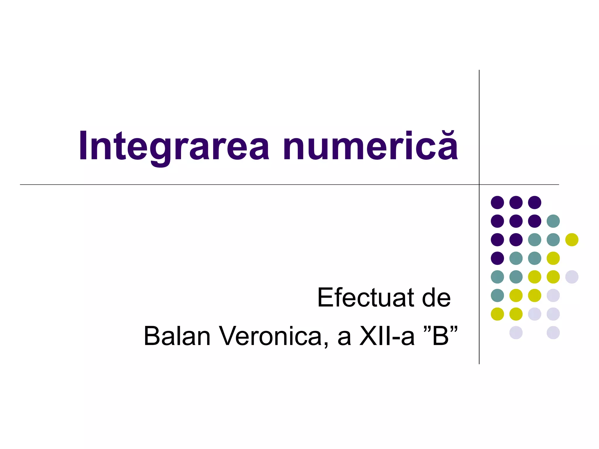 Documentul detaliază integrarea numerică, concentrându-se pe metoda dreptunghiurilor pentru calculul aproximativ al integralei definite. Se discută variațiile acestei metode, inclusiv algoritmii pentru dreptunghiul de mijloc, stânga și dreapta. De asemenea, sunt prezentate informații despre metoda trapezului în contextul integrării numerice.