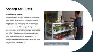 Dokumen ini membahas konsep integrasi satu data untuk menyatukan berbagai sistem dan data seperti yang dilakukan warteg untuk menyatukan menu, harga, ukuran porsi, dan metode pembayaran, serta menggunakan data tersebut untuk evaluasi kinerja dan memperoleh umpan balik pelanggan. Dokumen ini juga menyebutkan beberapa program yang dapat dilibatkan seperti akreditasi perpustakaan atau program studi yang dapat menggunak