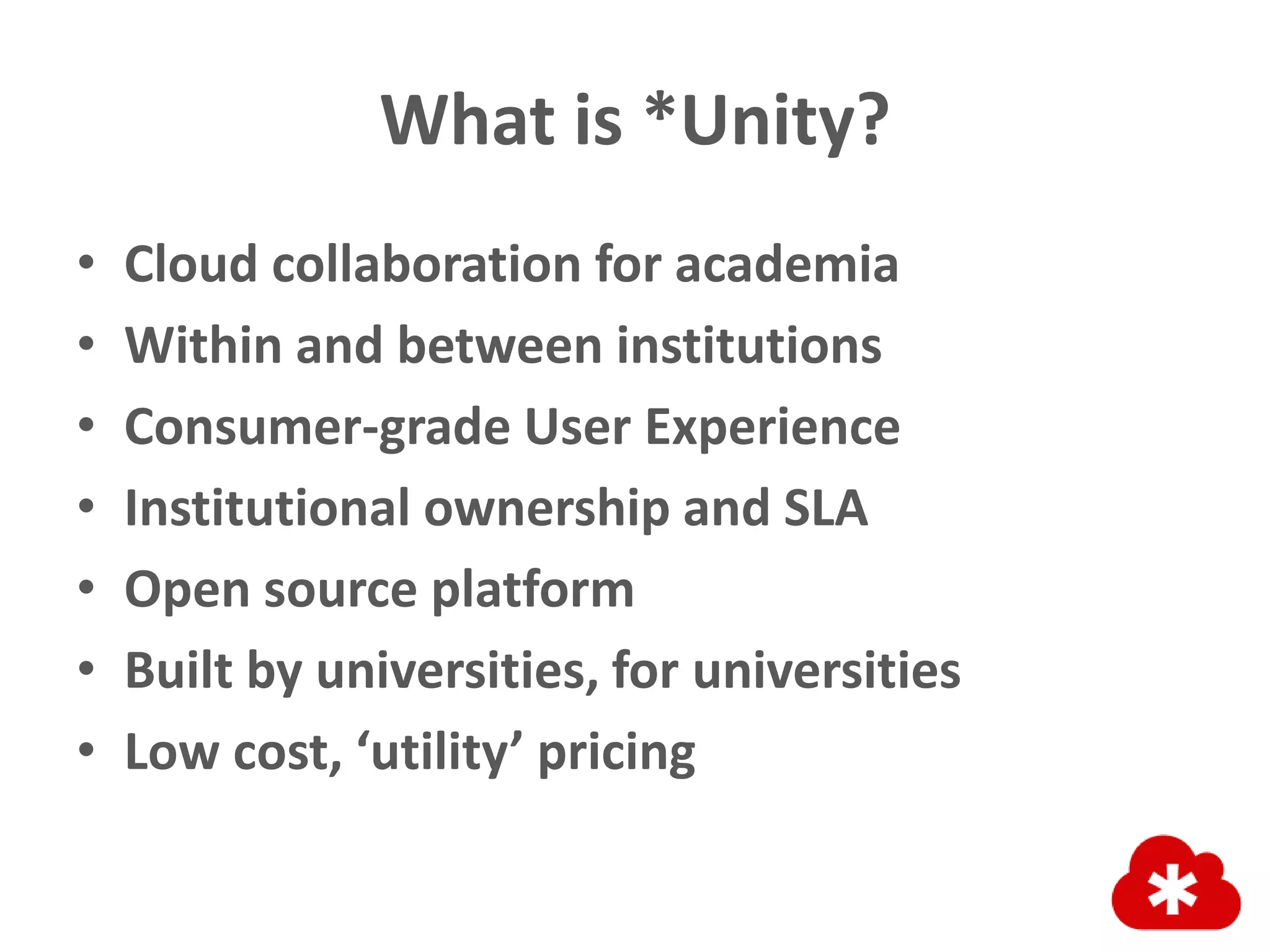 Unity is an open source cloud collaboration platform for academia that provides a consumer-grade user experience. It allows for collaboration within and between institutions at a low cost using a utility pricing model. The platform is owned and managed by the institutions with institutional data ownership and service level agreements. Unity provides an alternative to tools like SharePoint, Google Docs, and Microsoft 365 for collaboration, research networking, informal learning, administration, and more in a multi-tenant environment controlled by each institution.