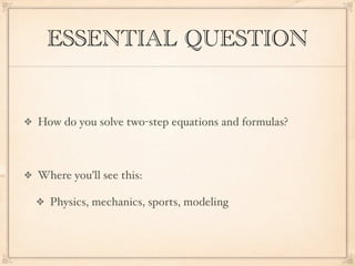 This document provides examples for solving two-step equations and formulas. It begins by defining a two-step equation as an equation that requires two steps to solve. It then shows worked examples of solving two-step equations by adding or subtracting the same quantity to both sides. The document also demonstrates solving formulas for a given variable and checking solutions. Key steps include isolating the variable of interest and performing inverse operations.