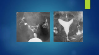 This document outlines an integrated approach to infertility workup. It discusses evaluating the male partner, ovarian function, tubal function, and the uterus. For the male partner, a history, examination, and semen analysis are recommended. Ovarian function is assessed through menstrual history, ultrasound, and hormone levels. Tubal function can be evaluated with HSG, laparoscopy, or hysteroscopy. The uterus is examined with imaging like HSG, ultrasound, or hysteroscopy and potentially endometrial biopsy. A complete workup considers factors from both the male and female partners.